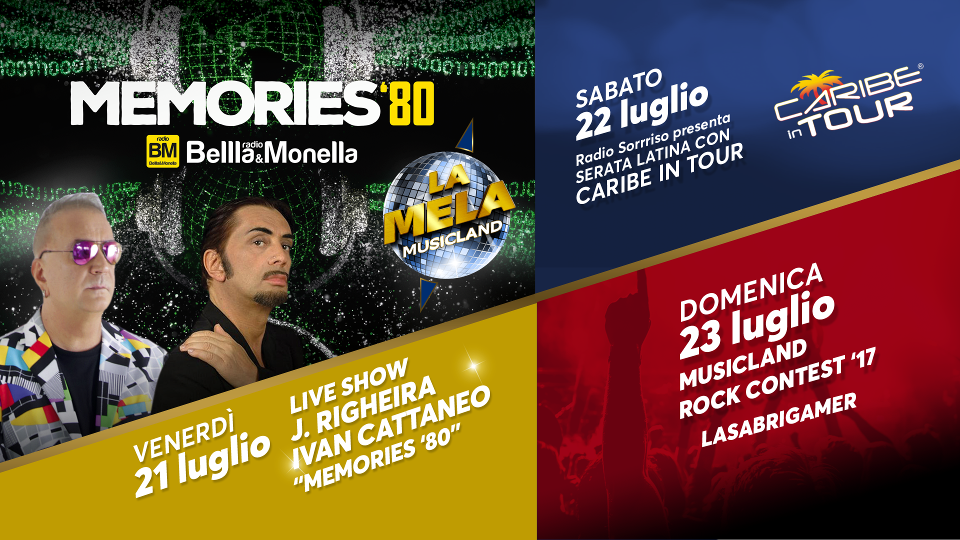 Protagonisti di una nuova settimana targata Mela MusicLand sono gli anni '80! Faremo un salto nella Disco Dance per ballare di nuovo sulle note di Johnson Righeira, per poi cantare con Ivan Cattaneo, anche lui questo weekend sul nostro palco! Se avete voglia di qualcosa di latino, non perdetevi il calore latineggiante dei Caribe, che sabato vi faranno scatenare di nuovo sulla pista. Domenica, appuntamento con Radio Marilù e il Rock Contest 2017. Special Guest: LaSabriGamer!