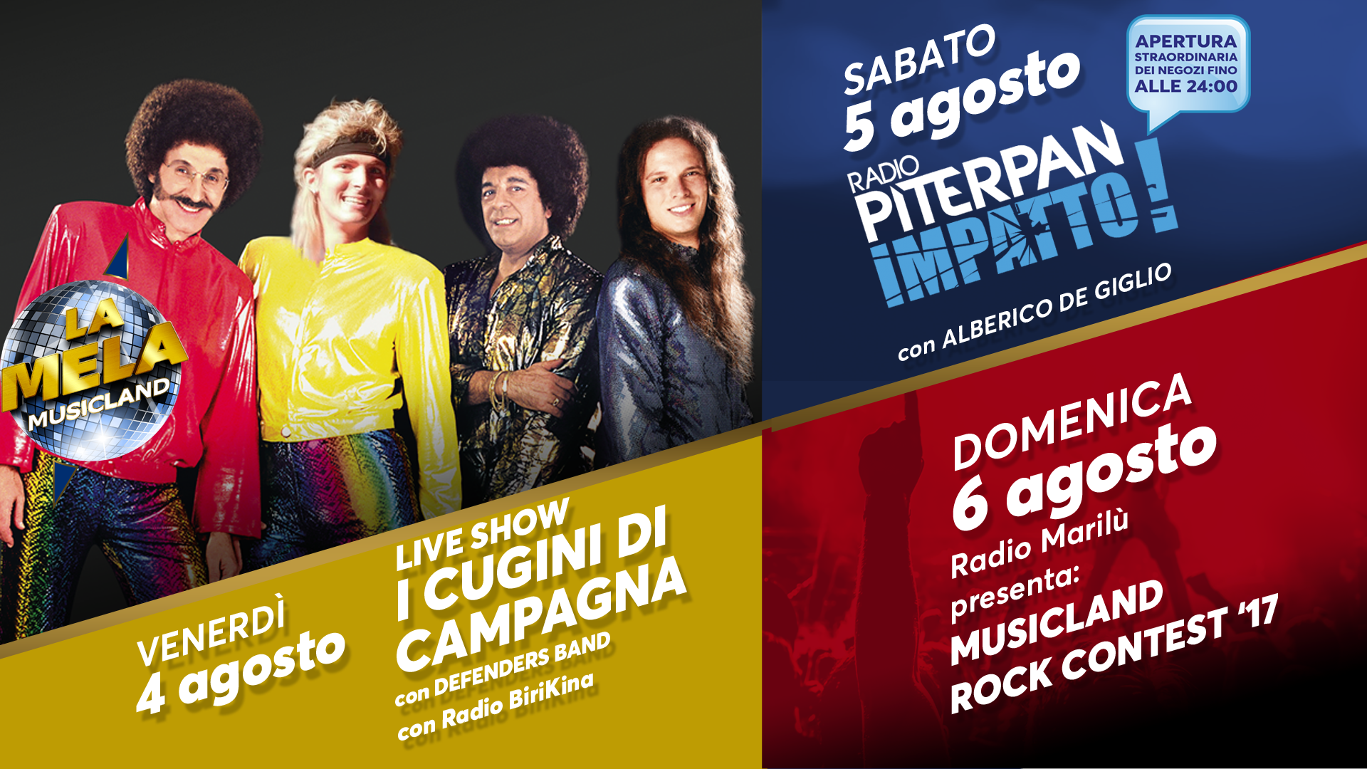 La musica italiana è ricca di successi. Tra questi, i Cugini di Campagna hanno fatto storia e venerdì la porteranno sul nostro palco! Sabato, l'aria diventa remix con Radio PiterPan e la grinta di Lady Helen, che si accompagnerà in consolle a Matt Joe e Dj Mastrix. Altra domenica, altro appuntamento con il Rock Contest 2017, la sfida tra band diretta da Radio Marilù, Adelina Putin presentatrice straordinaria. Special Guest: Alberico De Giglio!