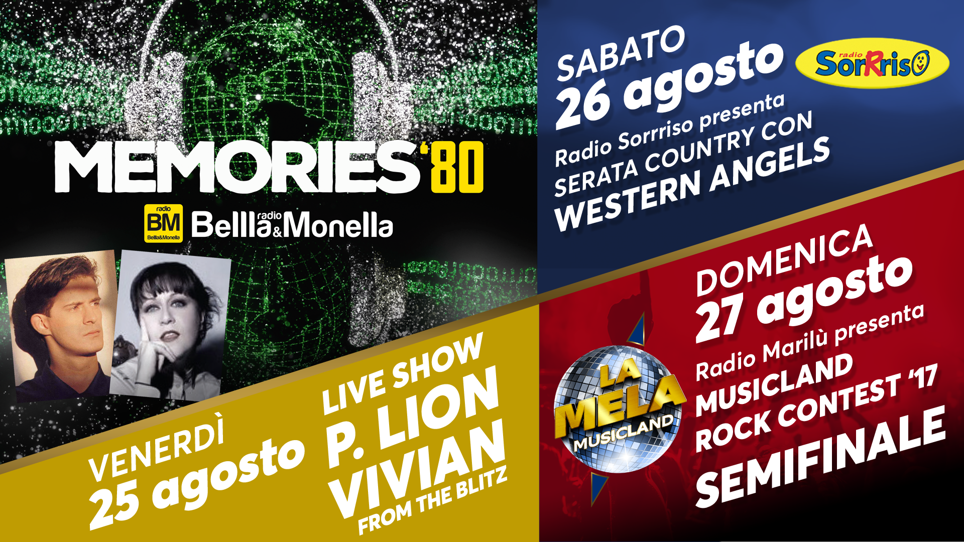 Venerdì, facciamo un salto negli anni '80 con Radio Bellla e Monella e Monica Morgan alla direzione, Special Guest: il mitico P. Lion e Vivian from The Blitz con tutta la sua energia! Sabato torniamo in stile country con Radio Sorrriso, attraverso i passi di Western Angels e Desperados Country Friends. Domenica vi aspettiamo per la semifinale del Rock Contest 2017 con Radio Marilù!