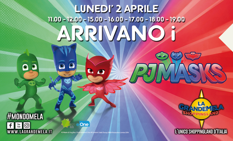 I PJ MASKS arrivano a La Grande Mela! I tre protagonisti della famosa serie animata incontreranno tutti i bambini presenti, per una giornata ricca di emozioni e superpoteri! Ti aspettiamo dalle 11.00 alle 19.00 con un evento dedicato ai bambini, che potranno conoscere e fare tante foto con i fantastici Superpigiamini.