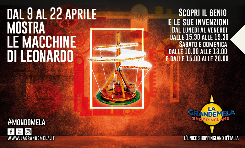 La ricerca tecnologica del genio fiorentino è al centro dell'evento educativo di due settimane "Le Macchine di Leonardo", che si terrà da lunedì 9 a domenica 22 aprile a La GrandeMela. Nelle gallerie del centro commerciale rimarranno esposti una ventina di modelli dedicati alla trasmissione del moto che illustreranno le applicazioni pratiche degli studi compiuti dal noto inventore.