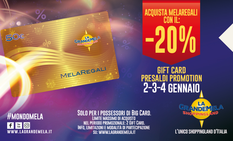 se sei maggiorenne e hai la Big Card nelle giornate di mercoledì 2, giovedì 3 e venerdì 4 Gennaio potrai acquistare uan gift card de La Grande Mela con uno sconto del 20%!