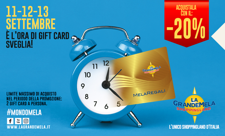 Solo l'11, 12 e 13 Settembre dalle 9 alle 21 all`Infopoint i possessori della Big Card potranno acquistare la gift card de La GrandeMela con il 20% di sconto!