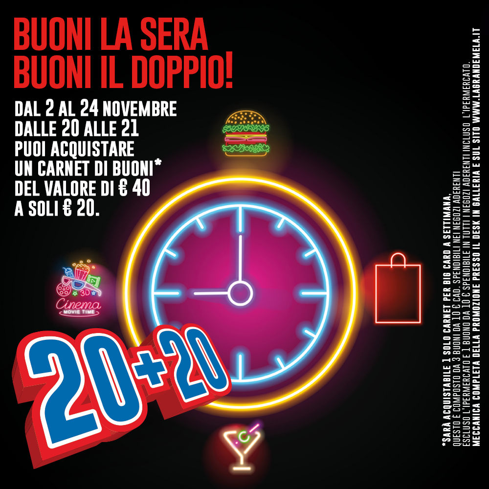 Dal 2 al 24 novembre, dalle 20.00 alle 21.00 potrai acquistare a soli € 20,00 un carnet di 4 buoni per un valore complessivo di € 40,00.