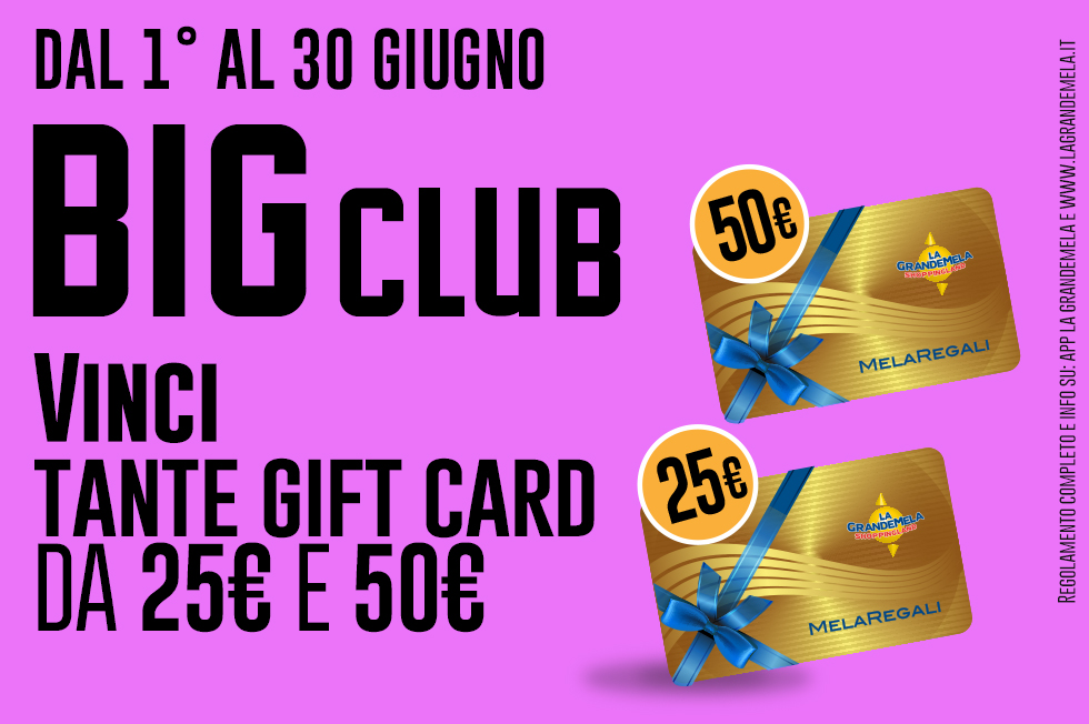 Dall’1 al 30 Giugno, con BIG CLUB, una giftcard Melaregali del valore di €25,00 e €50,00 spendibili nei negozi del Centro!