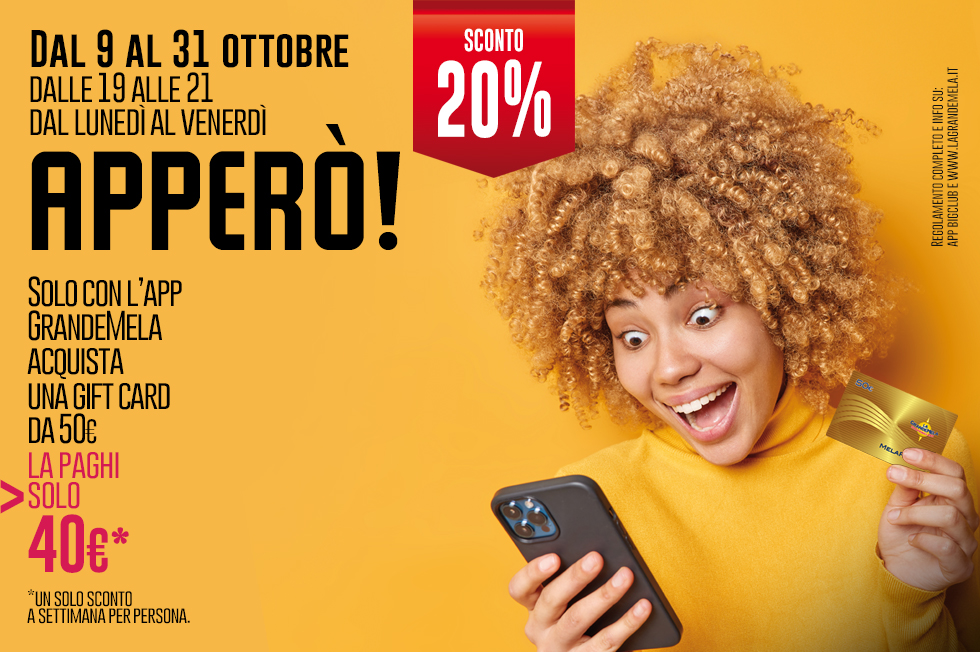 Fino al 31 ottobre se sei registrato sull'app de La Grande Mela potrai acquistare una Gift Card Melaregali del valore di €50,00 a soli €40,00!