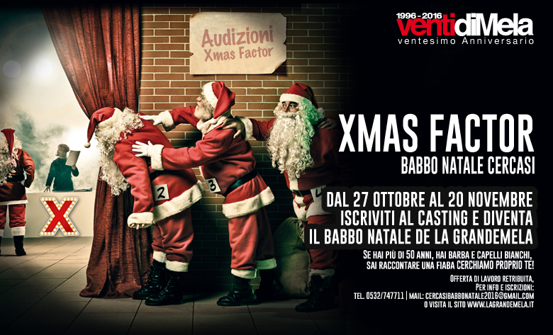 Il Centro Commerciale “La Grande Mela Shoppingland” di Lugagnano di Sona (VR) seleziona nell’area geografica di Verona e provincia, uomini di età superiore ai 50 anni, per individuare il candidato adatto ad interpretare il ruolo di Babbo Natale ufficiale di La Grande Mela, nel mese di Dicembre 2016. Gli aspiranti a questo ruolo dovranno avere caratteristiche fisiche e attitudini caratteriali conformi al ruolo e ottime doti comunicative ed empatiche specialmente nei confronti dei bambini.