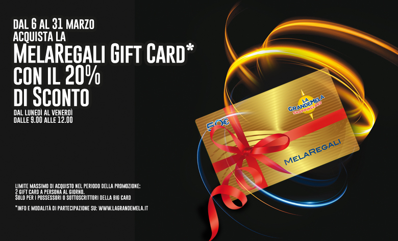 Dal 6 al 31 marzo, acquista la Gift Card Melaregali presso il nostro Infopoint con il 20% di sconto.