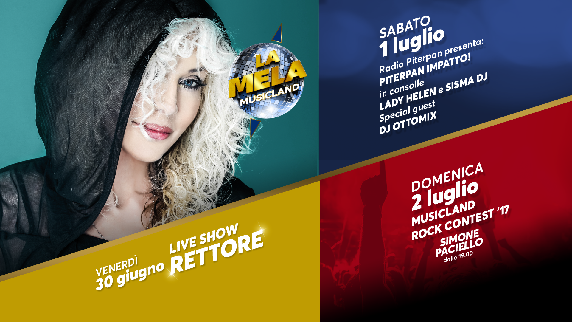 Questo fine settimana verrà a trovarci il cobra più famoso d’Italia, quello di Donatella Rettore! Sarà proprio la cantante ad aprire questo nuovo weekend in musica, che continuerà con Lady Helen e Sisma Dj alla console per un sabato tutto ’90 con Radio PiterPan e Dj Ottomix. Domenica 2 luglio, sul palco della Mela MusicLand farà capolino la Web Star Simone Paciello per poi lasciare la scena a Radio Marilù e alle band del Rock Contest 2017. Un altro fine settimana di emozioni, un altro fine settimana a La Grande Mela!