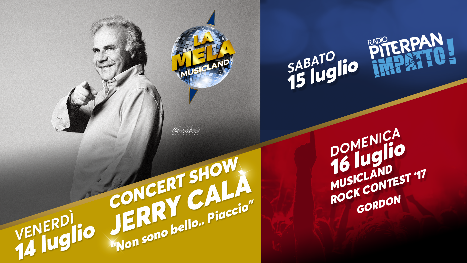 Non poteva di certo mancare lui alla Mela MusicLand: Jerry Calà! "Una vita da libidine" è lo slogan del tour che porterà uno dei comici più amati d'Italia anche sul nostro palco! Il sabato a La Grande Mela porta fuori dallo studio di Radio PiterPan le voci più famose de Lo Sfogatoio: Marco Baxo e Fedro! E per concludere, domenica 16 luglio, la Mela MusicLand sarà tappa del "si sboccia poveri tour" dell'imitatore femminile più famoso dei social: il mitico Gordon, che lascerà poi il posto alla nostra sfida musicale, il Rock Contest 2017. Che estate a La Grande Mela!