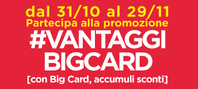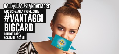 Fai acquisti nel periodo promozionale, ACCUMULA SCONTI sulla tua BIG CARD, caricando i tuoi scontrini presso i totem. Entro il 29/11 presso il box inf (...)